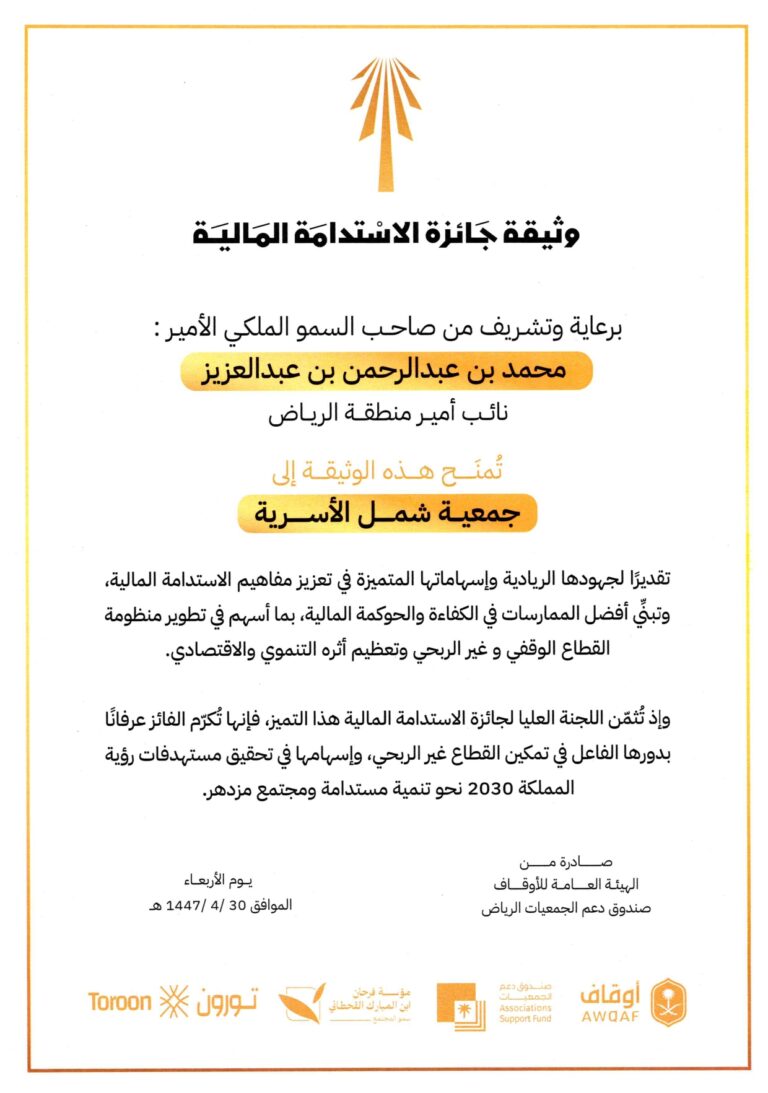 اختيار ( جمعية شمل ) من الجمعيات المتميزة على مستوى المنطقة الشرقية .
